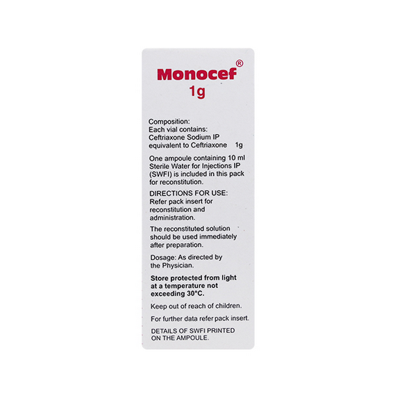 Monocef 1gm Injection is a powerful cephalosporin antibiotic designed to treat a wide range of bacterial infections, such as those affecting the brain, lungs, urinary tract, skin, bones, and heart. Given by injection, it works by halting bacterial growth, thereby controlling the spread of infection. It may also be used to prevent infection during surgery.